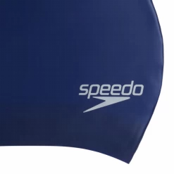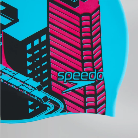 Gorro natación Speedo Slogan Print azul con rascacielos se ajusta con comodidad a la cabeza para proteger el pelo del cloro y de los agentes químicos del agua de la piscina.